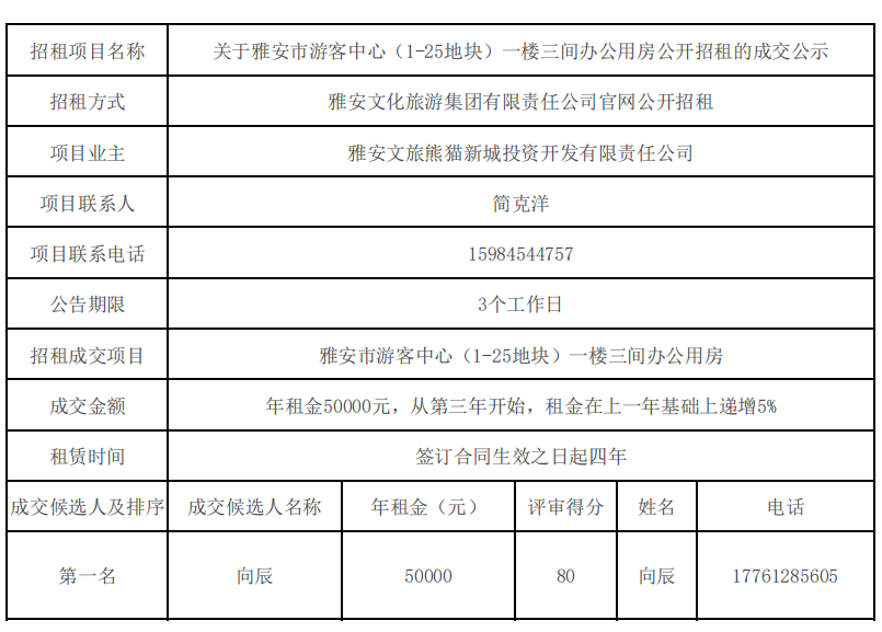 關(guān)于雅安市游客中心(1-25地塊)一樓三間辦公用房公開招租的成交公示